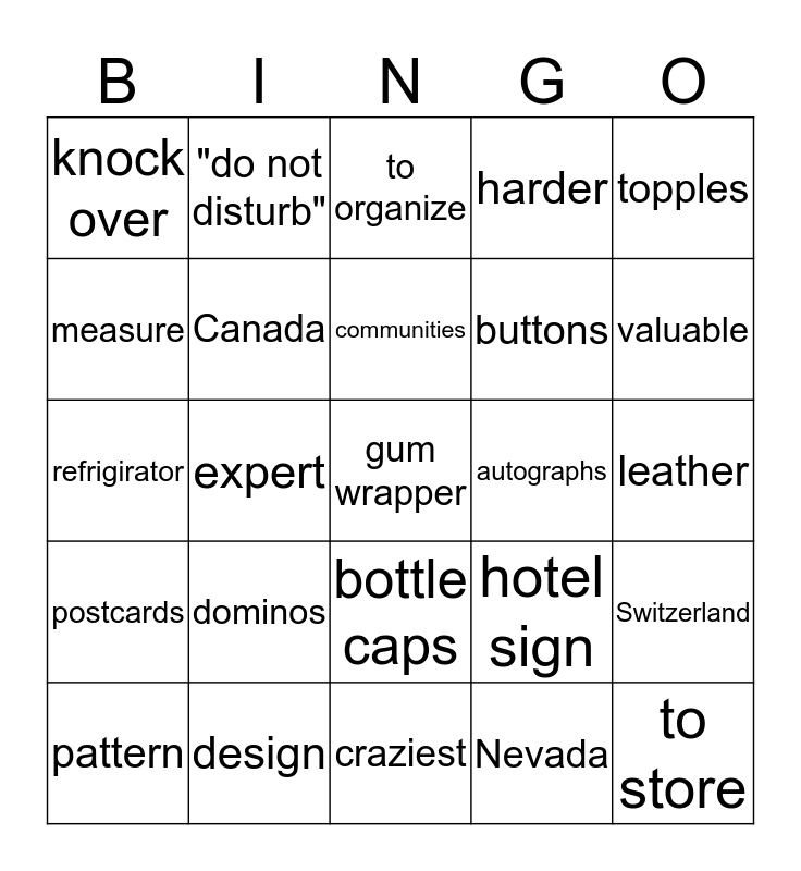 This bingo card has a free space and 24 words: dominos, design, communities, pattern, topples, knock over, measure, "do not disturb", autographs, bottle caps, buttons, refrigirator, hotel sign, Switzerland, Canada, Nevada, leather, to organize, valuable, expert, to store, postcards, harder and craziest.