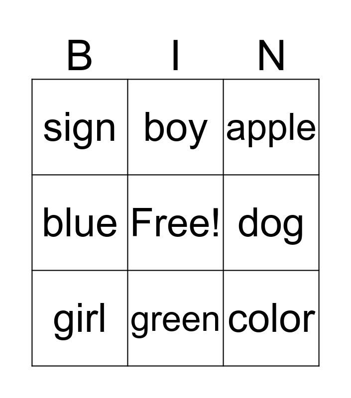 This bingo card has a free space and 8 words: dog, apple, boy, girl, sign, color, blue and green.