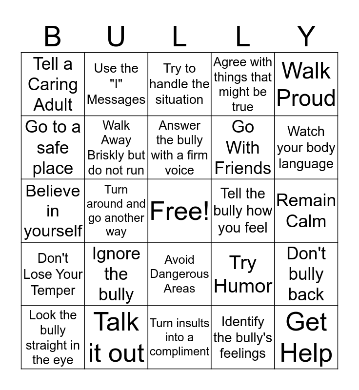 This bingo card has a free space and 24 words: Ignore the bully, Talk it out, Answer the bully with a firm voice, Look the bully straight in the eye, Walk Proud, Tell a Caring Adult, Go to a safe place, Use the "I" Messages, Tell the bully how you feel, Avoid Dangerous Areas, Go With Friends, Believe in yourself, Try Humor, Don't bully back, Walk Away Briskly but do not run, Identify the bully's feelings, Remain Calm, Try to handle the situation, Watch your body language, Turn around and go another way, Get Help, Don't Lose Your Temper, Agree with things that might be true and Turn insults into a compliment.