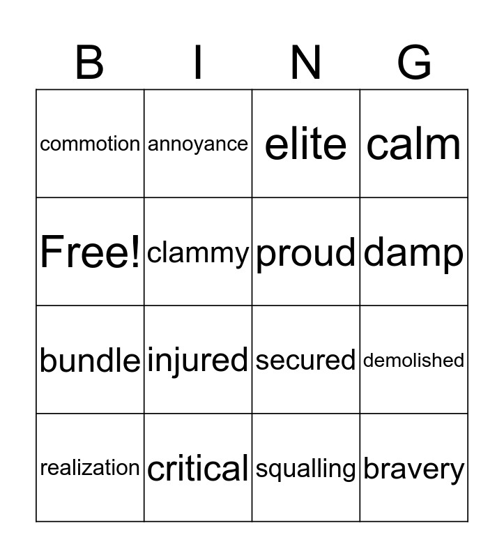 This bingo card has 16 words: critical, demolished, elite, commotion, bundle, annoyance, secured, squalling, Free!, clammy, realization, calm, injured, damp, proud and bravery.