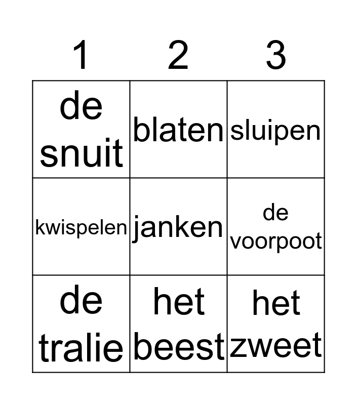 This bingo card has a free space and 26 words: balken, bijten, het beest, mager, het zweet, de snuit, de voorpoot, blaten, de dierenarts, gevaarlijk, blazen, het insect, de klauw, beven, sloom, de ekster, kwispelen, voeren, sluipen, de vacht, de snavel, zoemen, de achterpoot, de reiger, de tralie and vochtig.