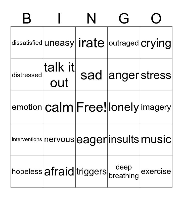 This bingo card has a free space and 24 words: nervous, afraid, sad, hopeless, crying, dissatisfied, distressed, uneasy, lonely, eager, anger, emotion, insults, music, talk it out, deep breathing, imagery, irate, stress, calm, exercise, interventions, outraged and triggers.