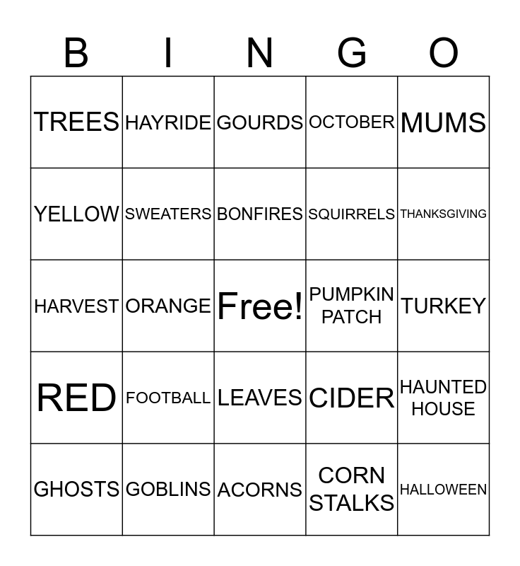 This bingo card has a free space and 27 words: CIDER, FALL, SQUIRRELS, ACORNS, YELLOW, GOURDS, HAYRIDE, RED, PUMPKIN PATCH, HAUNTED HOUSE, HARVEST, OCTOBER, GHOSTS, GOBLINS, THANKSGIVING, PUMPKINS, SWEATERS, BONFIRES, FOOTBALL, TREES, TURKEY, CORN STALKS, ORANGE, HALLOWEEN, LEAVES, MUMS and AUTUMN.