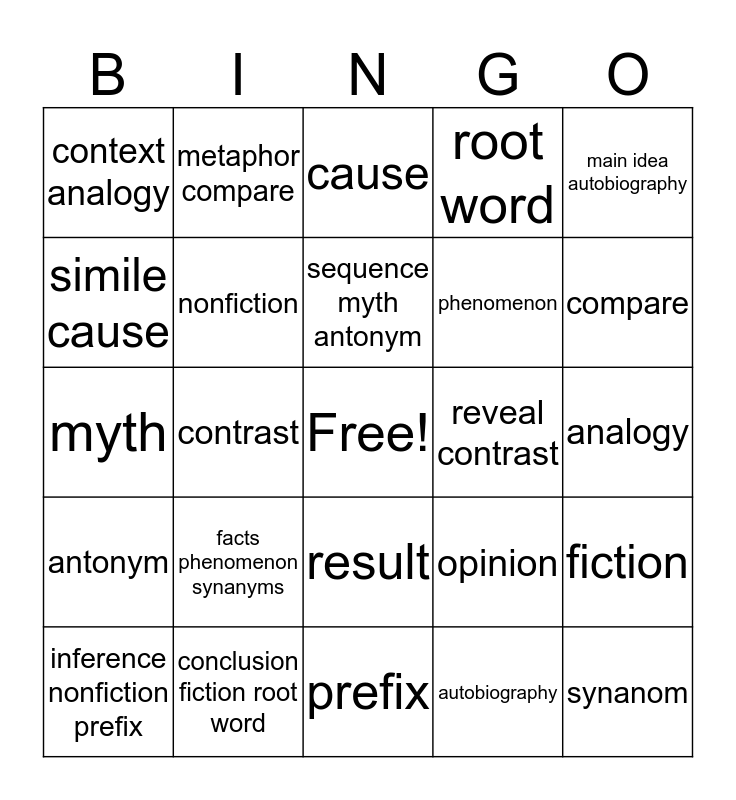 This bingo card has a free space and 24 words: facts phenomenon synanyms, conclusion fiction root word, sequence myth antonym, inference nonfiction prefix, main idea autobiography, context analogy, simile cause, metaphor compare, reveal contrast, result, phenomenon, myth, opinion, fiction, nonfiction, autobiography, analogy, cause, compare, contrast, synanom, antonym, root word and prefix.