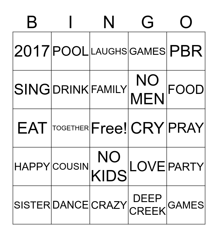 This bingo card has a free space and 24 words: SISTER, COUSIN, FAMILY, DEEP CREEK, PBR, 2017, POOL, LAUGHS, CRY, PRAY, EAT, DRINK, LOVE, PARTY, SING, DANCE, CRAZY, GAMES, FOOD, HAPPY, TOGETHER, NO KIDS, NO MEN and GAMES.