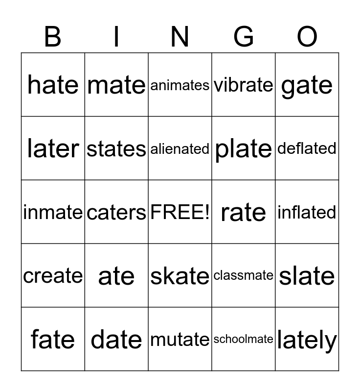 This bingo card has a free space and 24 words: ate, date, alienated, fate, gate, hate, later, mate, rate, skate, plate, inmate, classmate, slate, states, schoolmate, inflated, animates, deflated, caters, lately, create, vibrate and mutate.