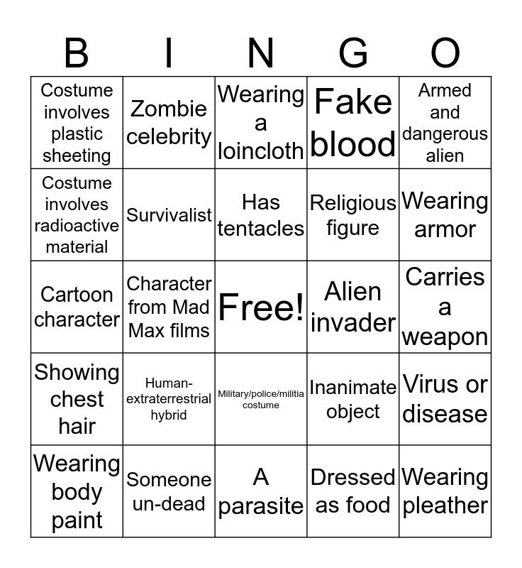 This bingo card has a free space and 25 words: Human-extraterrestrial hybrid, A parasite, Has tentacles, Wearing body paint, Armed and dangerous alien, Costume involves plastic sheeting, Costume involves radioactive material, Zombie celebrity, Alien invader, Military/police/militia costume, Religious figure, Cartoon character, Inanimate object, Virus or disease, Survivalist, Is a biohazard, Carries a weapon, Wearing a loincloth, Wearing armor, Character from Mad Max films, Wearing pleather, Someone un-dead, Showing chest hair, Fake blood and Dressed as food.