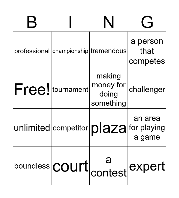 This bingo card has 16 words: court, an area for playing a game, tremendous, professional, unlimited, championship, plaza, a contest, Free!, tournament, boundless, a person that competes, competitor, challenger, making money for doing something and expert.