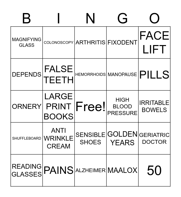 This bingo card has a free space and 47 words: 1967, 50, AARP, ALZHEIMER, ANTI WRINKLE CREAM, CANE, COLONOSCOPY, DENTURES, DEPENDS, ENSURE, FALSE TEETH, FIXODENT, GERIATRIC DOCTOR, GOLDEN YEARS, GRAY HAIR, HAIR LOSS, HEMORRHOIDS, HIGH BLOOD PRESSURE, HOT FLASHES, FACE LIFT, LARGE PRINT BOOKS, MAALOX, MAGNIFYING GLASS, MANOPAUSE, HEARING AID, PILLS, READING GLASSES, SENIOR CITIZEN, SENSIBLE SHOES, SHUFFLEBOARD, SUPPORT HOSE, ACHES, WALKER, GAS, GARDENING, PAINS, IRRITABLE BOWELS, ROCKING CHAIR, TIRED, NAPS, BRIDGE, ARTHRITIS, ORNERY, HUGS, MID LIFE, WRINKLES and PRUNE JUICE.