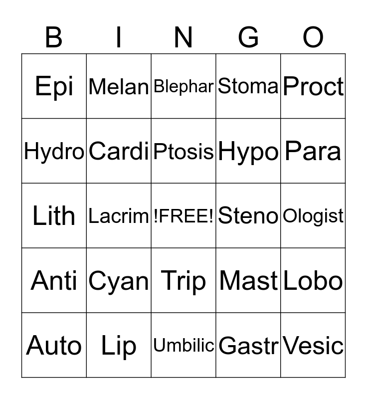 This bingo card has a free space and 24 words: Cyan, Lip, Ptosis, Auto, Proct, Epi, Hydro, Melan, Steno, Trip, Hypo, Lith, Mast, Lobo, Cardi, Gastr, Ologist, Blephar, Para, Lacrim, Vesic, Anti, Stoma and Umbilic.