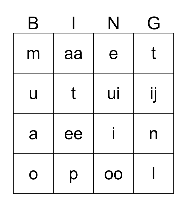 This bingo card has 19 words: i, k, e, l, n, u, oo, m, aa, a, ee, t, ui, p, o, ee, t, ij and s.