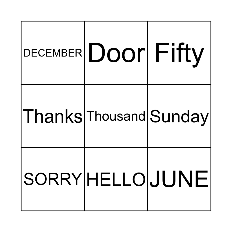 This bingo card has 64 words: Free!, Friends, Thursday, November, Mobile phone, Mum, Door, Disco, HELLO, TUESDAY, Well, Goodbye, EARLY, Thousand, Hundred, Sunday, MONDAY, DECEMBER, APRIL, JUNE, JULY, Fine, Thanks, AIRPORT, Tennis, Computer, PEN, Table, Zero, TEN, MILLION, Picture, Am, Are, Is, HOW, Nice, MEET, WHAT'S, SORRY, HI, Train, Egg, Bike, FISH, DAY, MONTH, Week, YEAR, Week, Day, MIKE, Hannah, Twenty, Thirty, Forty, Fifty, WEEKEND, Thirteen, Fourteen, Sixteen, Seventeen, Three and Tree.