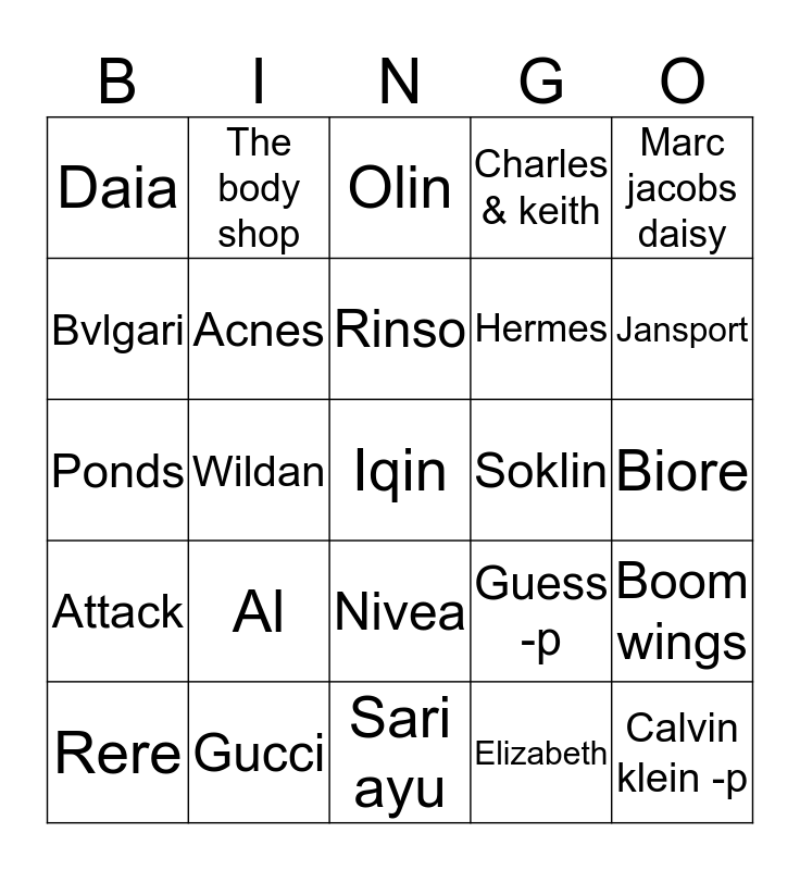 This bingo card has a free space and 24 words: Al, Gucci, Rinso, Rere, Marc jacobs daisy, Daia, Bvlgari, The body shop, Soklin, Nivea, Hermes, Ponds, Guess -p, Boom wings, Acnes, Elizabeth, Biore, Olin, Jansport, Wildan, Calvin klein -p, Attack, Charles & keith and Sari ayu.