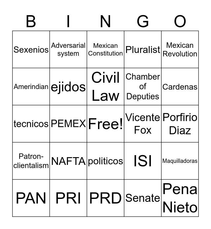 This bingo card has a free space and 24 words: NAFTA, PRI, Civil Law, PAN, Mexican Revolution, Sexenios, Amerindian, Adversarial system, Vicente Fox, politicos, Chamber of Deputies, tecnicos, ISI, Maquilladoras, ejidos, Senate, Porfirio Diaz, Mexican Constitution, Cardenas, PEMEX, Pena Nieto, Patron-clientalism, Pluralist and PRD.