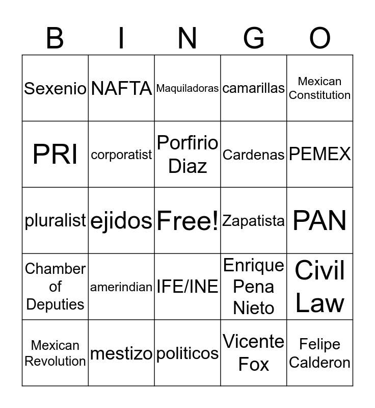 This bingo card has a free space and 24 words: amerindian, mestizo, Porfirio Diaz, Mexican Revolution, Mexican Constitution, Sexenio, PRI, NAFTA, Zapatista, IFE/INE, Cardenas, pluralist, Enrique Pena Nieto, Civil Law, corporatist, Vicente Fox, PAN, Maquiladoras, PEMEX, ejidos, Felipe Calderon, Chamber of Deputies, camarillas and politicos.