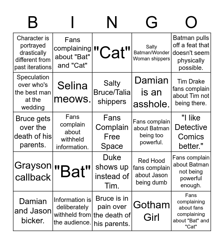 This bingo card has a free space and 24 words: "Bat", Information is deliberately withheld from the audience., Salty Bruce/Talia shippers, Damian and Jason bicker., Batman pulls off a feat that doesn't seem physically possible., Character is portrayed drastically different from past iterations, Speculation over who's the best man at the wedding, Fans complaining about "Bat" and "Cat", Fans complain about Batman being too powerful., Duke shows up instead of Tim., Damian is an asshole., Bruce gets over the death of his parents., Red Hood fans complain about Jason being dumb, Fans complain about Batman not being powerful enough., Selina meows., Gotham Girl, "I like Detective Comics better.", "Cat", Tim Drake fans complain about Tim not being there., Fans complain about withheld information., Fans complaining about fans complaining about "Bat" and "Cat", Grayson callback, Salty Batman/Wonder Woman shippers and Bruce is in pain over the death of his parents..