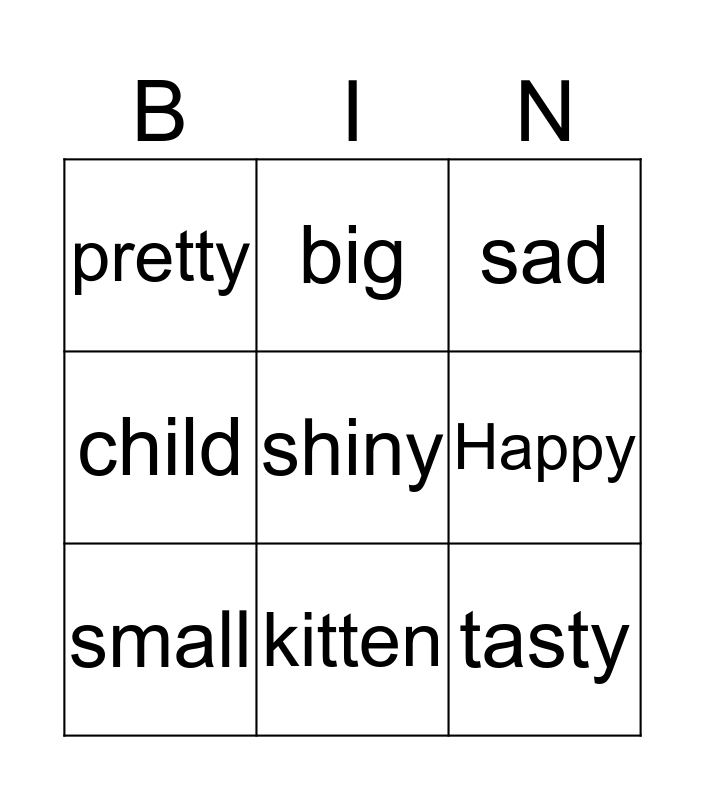 This bingo card has a free space and 8 words: Happy, sad, big, small, pretty, tasty, child and kitten.