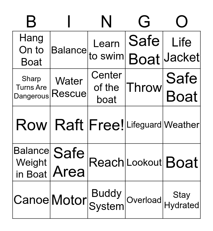 This bingo card has a free space and 26 words: Reach, Overload, Center of the boat, Motor, Life Jacket, Hang On to Boat, Sharp Turns Are Dangerous, Balance, Weather, Lookout, Throw, Row, Boat, Canoe, Raft, Don’t Go, Safe Boat, Balance Weight in Boat, Learn to swim, Stay Hydrated, Safe Boat, Buddy System, Lifeguard, Safe Area, Water Rescue and Sunscreen.