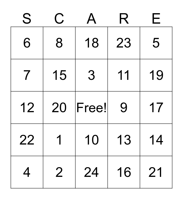 This bingo card has a free space and 24 words: 1, 2, 3, 4, 5, 6, 7, 8, 9, 10, 11, 12, 13, 14, 15, 16, 17, 18, 19, 20, 21, 22, 23 and 24.