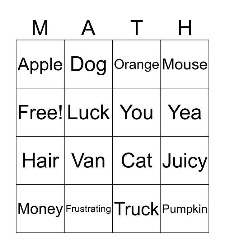 This bingo card has 16 words: Frustrating, Juicy, Orange, Apple, Hair, Dog, Cat, Truck, Free!, Luck, Money, Mouse, Van, Yea, You and Pumpkin.