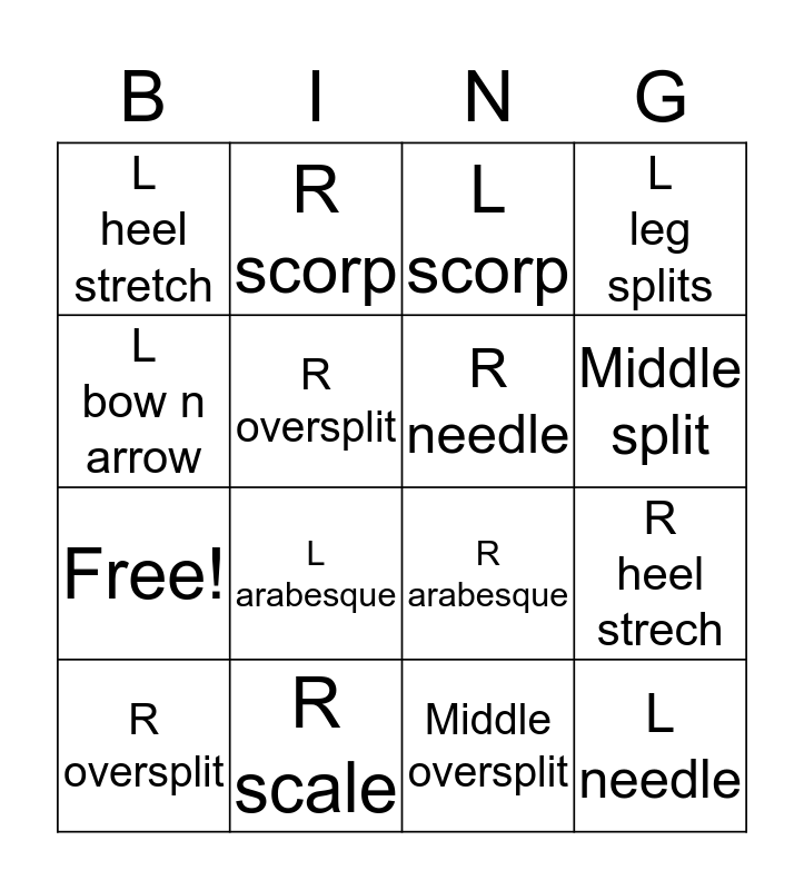 This bingo card has 20 words: R heel strech, R bow n arrow, L scorp, L scale, R oversplit, L bow n arrow, R scale, L heel stretch, Free!, R scorp, L arabesque, R arabesque, R oversplit, L needle, R needle, R leg splits, Middle split, L leg splits, Middle oversplit and Free.