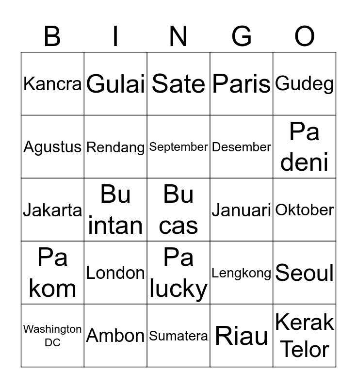 This bingo card has a free space and 24 words: London, Ambon, September, Washington DC, Gudeg, Kancra, Agustus, Gulai, Januari, Pa lucky, Desember, Jakarta, Lengkong, Seoul, Rendang, Riau, Oktober, Sate, Pa deni, Bu intan, Kerak Telor, Pa kom, Paris and Sumatera.