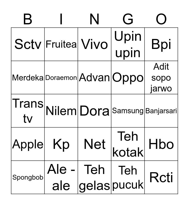 This bingo card has a free space and 24 words: Kp, Ale - ale, Advan, Spongbob, Bpi, Sctv, Merdeka, Fruitea, Samsung, Net, Oppo, Trans tv, Teh kotak, Hbo, Doraemon, Teh pucuk, Banjarsari, Vivo, Adit sopo jarwo, Nilem, Rcti, Apple, Upin upin and Teh gelas.