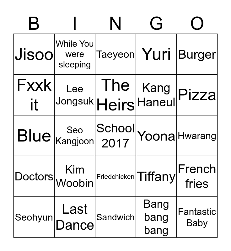 This bingo card has a free space and 24 words: Kim Woobin, Last Dance, The Heirs, Seohyun, Burger, Jisoo, Fxxk it, While You were sleeping, Yoona, Friedchicken, Kang Haneul, Blue, Tiffany, French fries, Lee Jongsuk, Bang bang bang, Hwarang, Taeyeon, Pizza, Seo Kangjoon, Fantastic Baby, Doctors, Yuri and Sandwich.