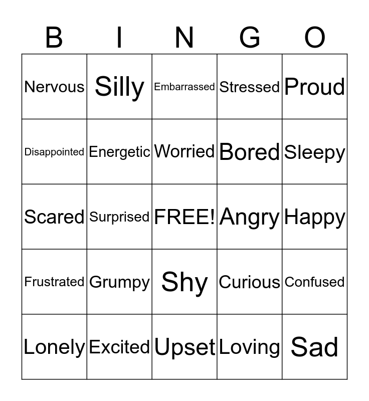 This bingo card has a free space and 24 words: Grumpy, Excited, Worried, Lonely, Proud, Nervous, Disappointed, Silly, Angry, Shy, Bored, Scared, Curious, Confused, Energetic, Loving, Happy, Embarrassed, Sleepy, Surprised, Sad, Frustrated, Stressed and Upset.