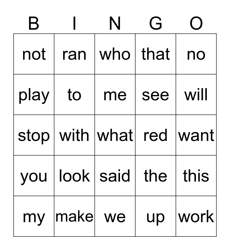 This bingo card has a free space and 24 words: look, make, me, my, no, not, play, ran, red, said, see, stop, the, this, to, up, want, who, will, with, work, you, that and we.