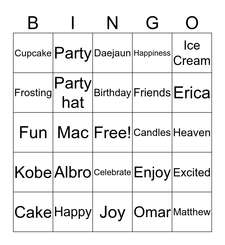 This bingo card has a free space and 24 words: Albro, Happy, Birthday, Cake, Ice Cream, Cupcake, Frosting, Party, Candles, Celebrate, Friends, Fun, Enjoy, Excited, Party hat, Omar, Heaven, Daejaun, Erica, Mac, Matthew, Kobe, Happiness and Joy.