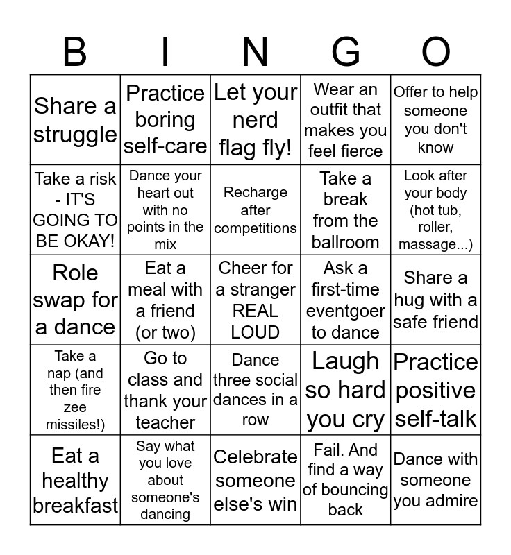 This bingo card has a free space and 24 words: Go to class and thank your teacher, Say what you love about someone's dancing, Recharge after competitions, Eat a healthy breakfast, Offer to help someone you don't know, Share a struggle, Take a risk - IT'S GOING TO BE OKAY!, Practice boring self-care, Ask a first-time eventgoer to dance, Dance three social dances in a row, Take a break from the ballroom, Role swap for a dance, Laugh so hard you cry, Practice positive self-talk, Dance your heart out with no points in the mix, Fail. And find a way of bouncing back, Share a hug with a safe friend, Let your nerd flag fly!, Look after your body (hot tub, roller, massage...), Eat a meal with a friend (or two), Dance with someone you admire, Take a nap (and then fire zee missiles!), Wear an outfit that makes you feel fierce and Celebrate someone else's win.