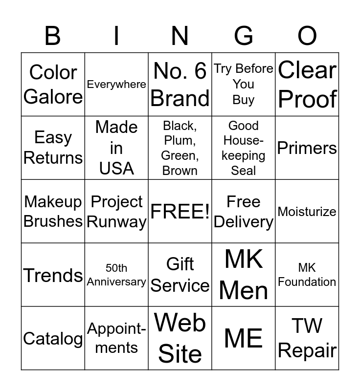 This bingo card has a free space and 24 words: 50th Anniversary, Appoint-ments, Black, Plum, Green, Brown, Catalog, Clear Proof, Color Galore, Easy Returns, Everywhere, Free Delivery, Gift Service, Good House-keeping Seal, Makeup Brushes, MK Men, MK Foundation, Made in USA, ME, Moisturize, No. 6 Brand, Primers, Project Runway, TW Repair, Trends, Try Before You Buy and Web Site.