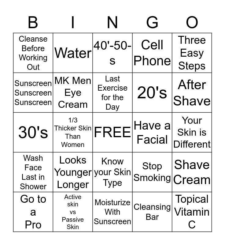 This bingo card has a free space and 24 words: Looks Younger Longer, Active skin vs Passive Skin, Last Exercise for the Day, Go to a Pro, Three Easy Steps, Cleanse Before Working Out, Sunscreen Sunscreen Sunscreen, Water, Have a Facial, Know your Skin Type, 20's, 30's, Stop Smoking, Shave Cream, MK Men Eye Cream, Cleansing Bar, Your Skin is Different, 40'-50-s, After Shave, 1/3 Thicker Skin Than Women, Topical Vitamin C, Wash Face Last in Shower, Cell Phone and Moisturize With Sunscreen.