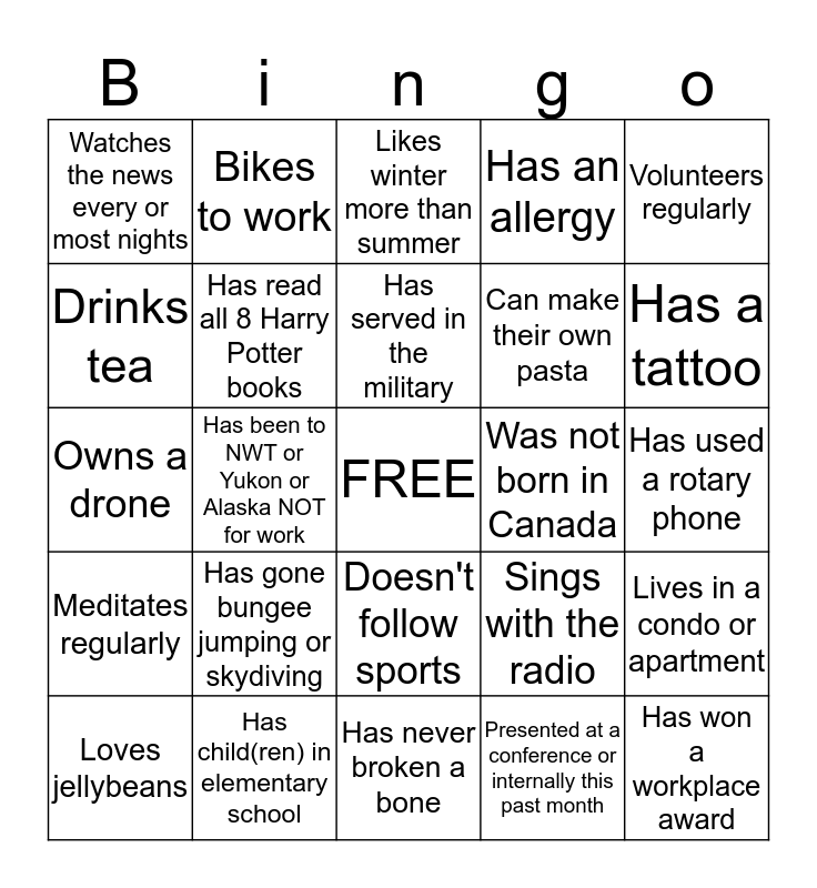 This bingo card has a free space and 24 words: Has gone bungee jumping or skydiving, Has child(ren) in elementary school, Has served in the military, Loves jellybeans, Volunteers regularly, Watches the news every or most nights, Drinks tea, Bikes to work, Was not born in Canada, Doesn't follow sports, Can make their own pasta, Owns a drone, Sings with the radio, Lives in a condo or apartment, Has read all 8 Harry Potter books, Presented at a conference or internally this past month, Has used a rotary phone, Likes winter more than summer, Has a tattoo, Has been to NWT or Yukon or Alaska NOT for work, Has won a workplace award, Meditates regularly, Has an allergy and Has never broken a bone.