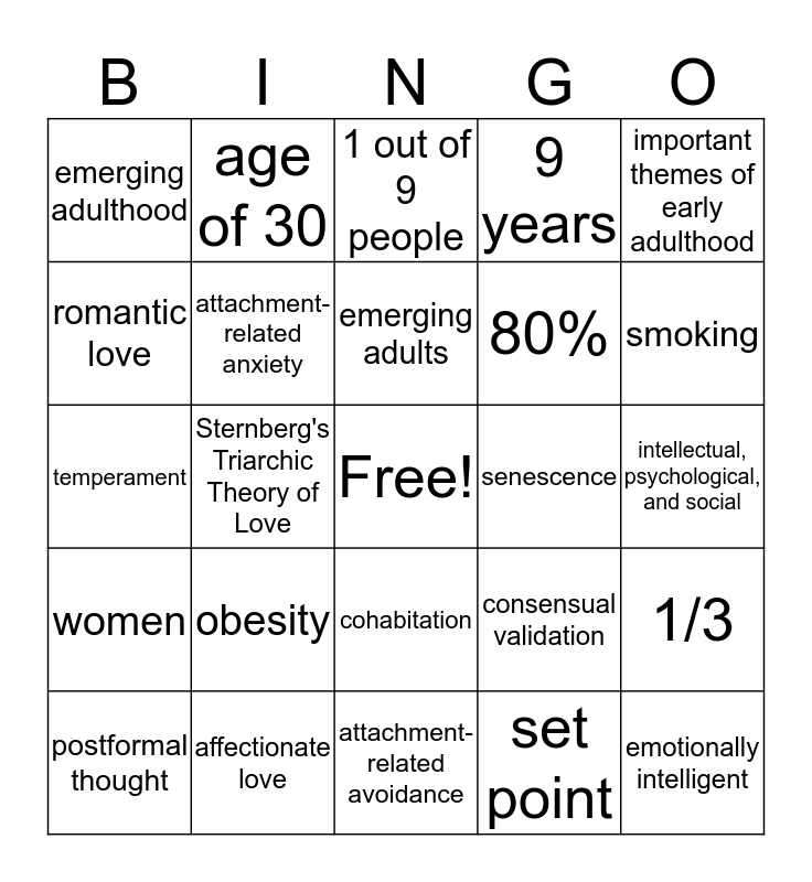 This bingo card has a free space and 25 words: postformal thought, obesity, emerging adults, set point, smoking, emerging adulthood, age of 30, 1 out of 9 people, 80%, 1/3, temperament, attachment-related anxiety, consensual validation, emotionally intelligent, romantic love, affectionate love, attachment-related avoidance, 9 years, intellectual, psychological, and social, women, Sternberg's Triarchic Theory of Love, cohabitation, senescence, important themes of early adulthood and personality type theory.