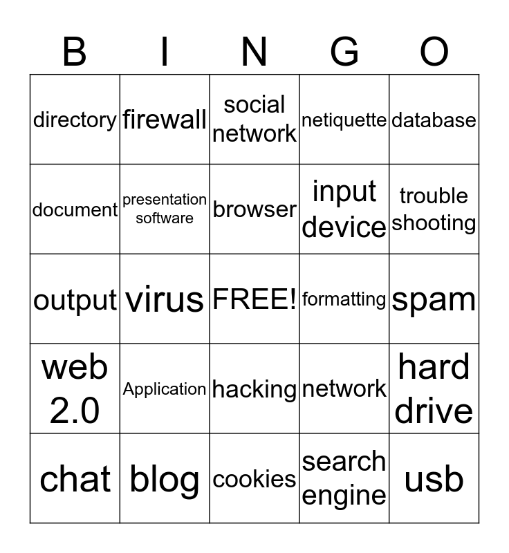 This bingo card has a free space and 24 words: Application, blog, browser, chat, database, directory, document, firewall, formatting, hacking, input device, output, network, hard drive, presentation software, search engine, spam, social network, trouble shooting, virus, usb, web 2.0, netiquette and cookies.