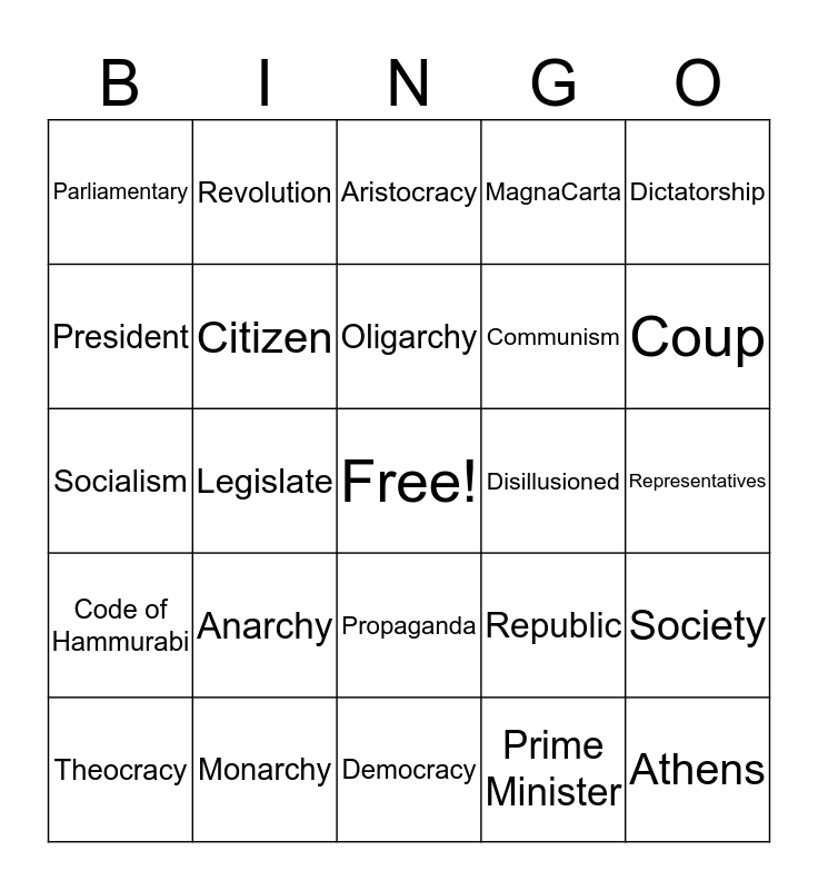 This bingo card has a free space and 24 words: Anarchy, Monarchy, Oligarchy, Theocracy, Dictatorship, Parliamentary, President, Revolution, Disillusioned, Propaganda, Communism, Socialism, Republic, Society, Citizen, Prime Minister, Representatives, Aristocracy, Coup, Legislate, Athens, Code of Hammurabi, MagnaCarta and Democracy.