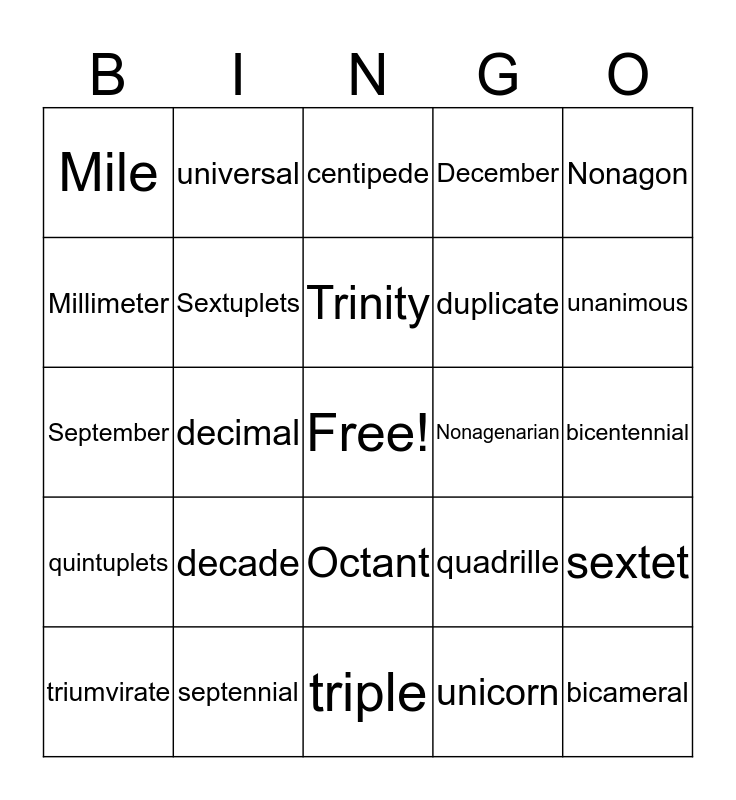 This bingo card has a free space and 35 words: Unity, Duel, Quarter, Sextuplets, Octant, December, Millimeter, Bicycle, Trinity, Quintet, September, Nonagon, Century, Cent, Mile, Nonagenarian, unicorn, decimal, quintuplets, bicameral, quadrille, triumvirate, sextet, septennial, centipede, unanimous, biceps, trivial, duplicate, bicentennial, octave, triple, decade, universal and dualism.