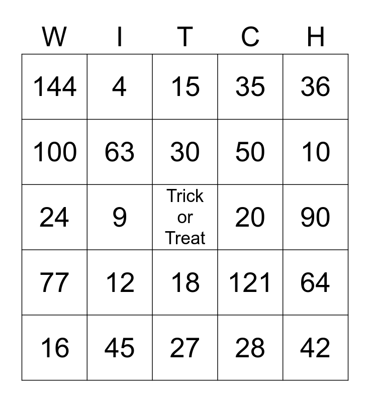 This bingo card has a free space and 24 words: 12, 45, 30, 16, 36, 144, 100, 4, 20, 18, 50, 24, 121, 64, 63, 28, 90, 15, 10, 9, 42, 77, 35 and 27.