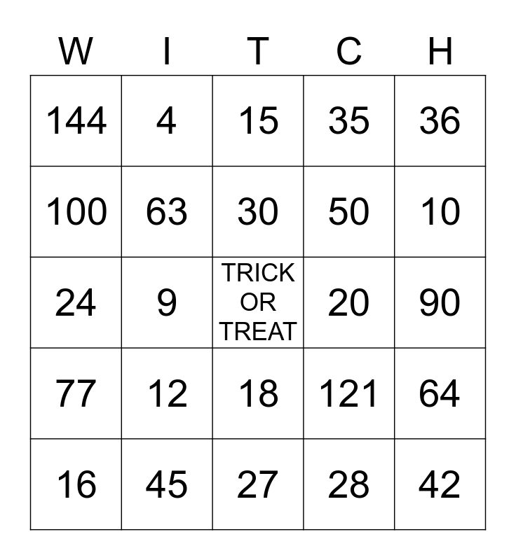 This bingo card has a free space and 24 words: 12, 45, 30, 16, 36, 144, 100, 4, 20, 18, 50, 24, 121, 64, 63, 28, 90, 15, 10, 9, 42, 77, 35 and 27.