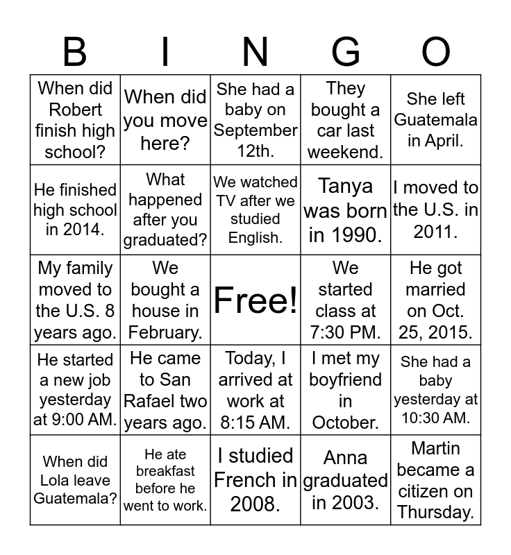 This bingo card has a free space and 24 words: He came to San Rafael two years ago., He ate breakfast before he went to work., We watched TV after we studied English., When did Lola leave Guatemala?, She left Guatemala in April., When did Robert finish high school?, He finished high school in 2014., When did you move here?, We started class at 7:30 PM., Today, I arrived at work at 8:15 AM., Tanya was born in 1990., My family moved to the U.S. 8 years ago., I met my boyfriend in October., She had a baby yesterday at 10:30 AM., What happened after you graduated?, Anna graduated in 2003., He got married on Oct. 25, 2015., She had a baby on September 12th., I moved to the U.S. in 2011., We bought a house in February., Martin became a citizen on Thursday., He started a new job yesterday at 9:00 AM., They bought a car last weekend. and I studied French in 2008..