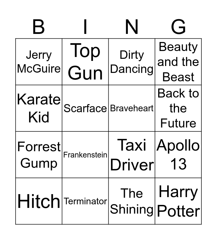 This bingo card has 19 words: Taxi Driver, The Wizard of Oz, Dirty Dancing, Harry Potter, Apollo 13, Karate Kid, The Shining, Jerry McGuire, Top Gun, Forrest Gump, Frankenstein, Scarface, Braveheart, Terminator, Hitch, Some Like it Hot, Beauty and the Beast, Back to the Future and Titanic.