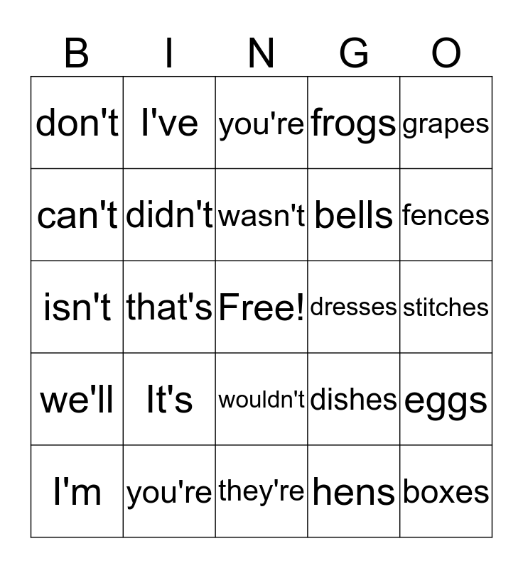 This bingo card has a free space and 24 words: I'm, It's, wasn't, hens, grapes, don't, I've, you're, dresses, stitches, isn't, didn't, dishes, eggs, can't, you're, they're, frogs, fences, we'll, that's, wouldn't, bells and boxes.
