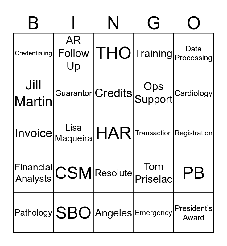 This bingo card has 64 words: Free!, Epic, Cedars-Sinai, PB, Rev Cycle, PBC, AR Follow Up, Customer Service, Credits, Refunds, Resolute, Prelude, Registration, Data Processing, Kathy Nielsen, Jill Martin, Lisa Maqueira, Credentialing, Coding, Ops Support, CSM, Financial Analysts, Training, Compliance, Claims, Group3, Group4, Group7, HIPAA, Statement, Patient, Doctor, Hospital, Vision, Cardiology, Pathology, Surgery, Emergency, Transplant, Guarantor, Invoice, Transaction, Charge Correction, CS-Link, MRN, HAR, SBO, President’s Award, Tom Priselac, John Jenrette, Torrance, Beverly Hills, Angeles, KJOC, SMGI, LACA, THO, SMOG, CSMG, CSHA, Cal Heart, CSVOMG, MGOE and ISP.