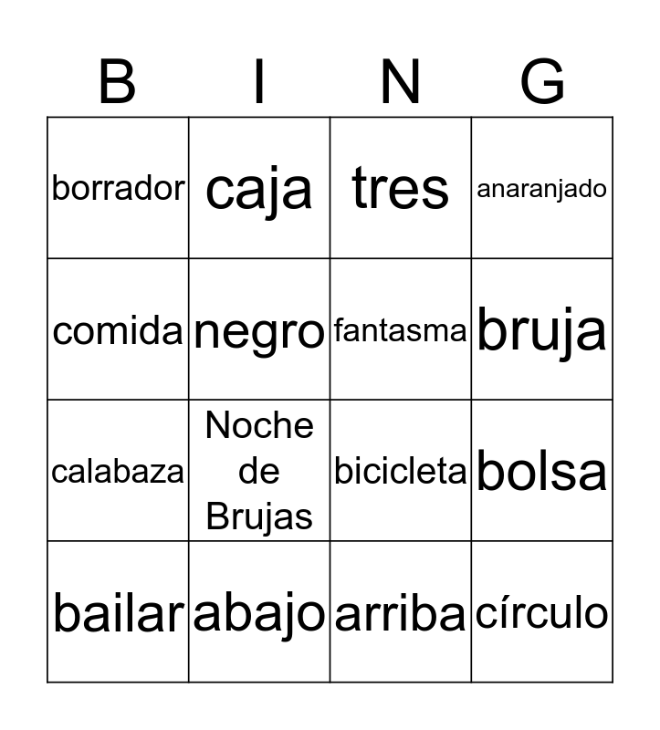 This bingo card has 16 words: abajo, bolsa, tres, borrador, calabaza, caja, bicicleta, arriba, comida, negro, bailar, anaranjado, Noche de Brujas, bruja, fantasma and círculo.