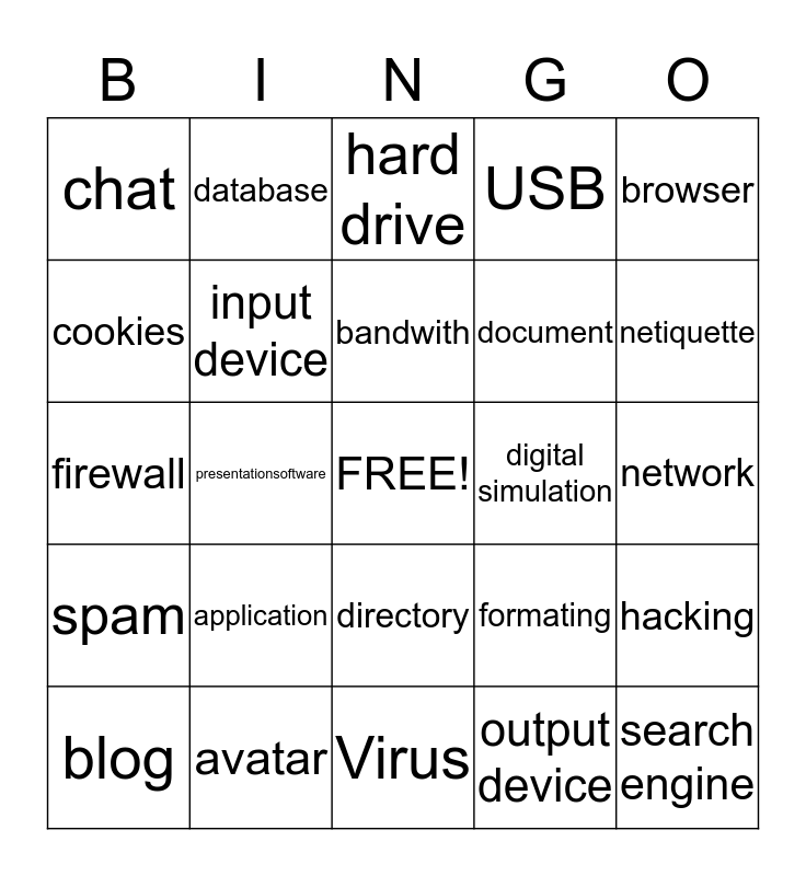 This bingo card has a free space and 24 words: application, avatar, bandwith, blog, browser, chat, cookies, database, digital simulation, directory, document, firewall, formating, hacking, input device, output device, network, hard drive, netiquette, presentationsoftware, search engine, spam, USB and Virus.