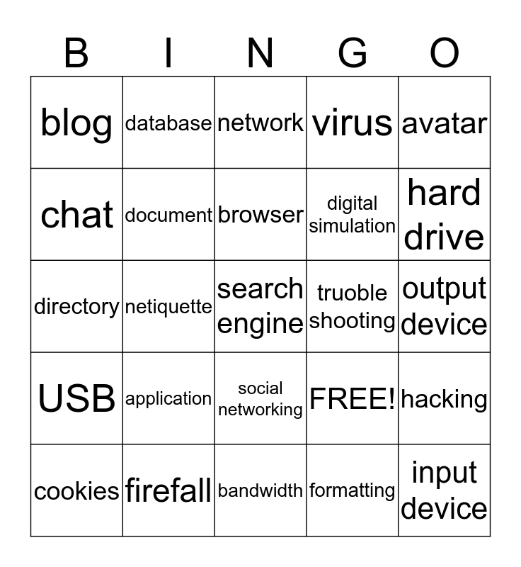 This bingo card has 25 words: application, bandwidth, browser, cookies, avatar, blog, chat, database, truoble shooting, social networking, digital simulation, directory, FREE!, hacking, document, input device, output device, network, hard drive, netiquette, search engine, firefall, USB, virus and formatting.
