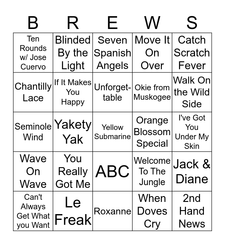 This bingo card has a free space and 24 words: You Really Got Me, Le Freak, Unforget-table, Can't Always Get What you Want, Catch Scratch Fever, Ten Rounds w/ Jose Cuervo, Chantilly Lace, Blinded By the Light, Orange Blossom Special, ABC, Okie from Muskogee, Seminole Wind, Welcome To The Jungle, Jack & Diane, If It Makes You Happy, When Doves Cry, I've Got You Under My Skin, Seven Spanish Angels, Walk On the Wild Side, Yakety Yak, 2nd Hand News, Wave On Wave, Move It On Over and Roxanne.