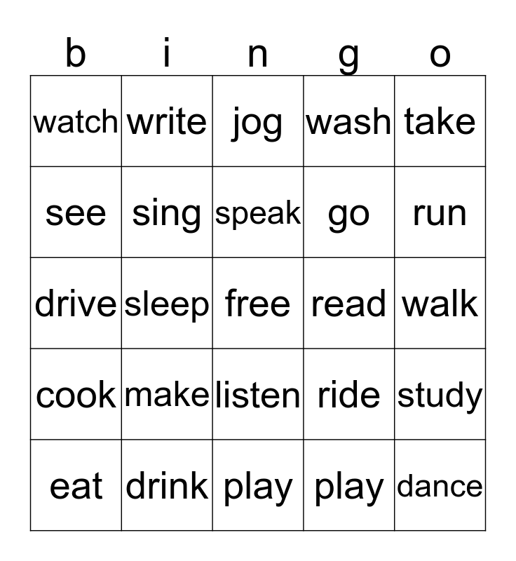 This bingo card has a free space and 24 words: make, drink, speak, eat, take, watch, see, write, read, listen, go, drive, ride, study, sing, play, walk, jog, run, sleep, dance, cook, wash and play.